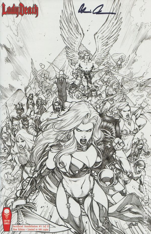 Raw Edition Cover by Diego Bernard - Limited to 400 copies. Written by Brian Pulido and Mike MacLean. Art by Diego Bernard. 'Deathocalypse', an official year-long company-wide event unfolds here! Heroes have fallen. Cities lay under siege. And swarms of progeny fill the skies, blotting out the sun. It seems no one can stand against the awesome power of Insurrectus. Bred to destroy worlds, the ruthless tyrant now sets his sights beyond Earth, commanding vicious hordes to invade every corner of the Infinityverse. Humanity's only hope lies in Hell's most fearsome warrior witch - Lady Death! There can be only two outcomes for our deadly diva: victory or total DEATHOCALYPSE! 40 pages, full color. NOTE: Generic image is of a signed copy, this does not necessarily reflect all copies. Cover price $40.00.