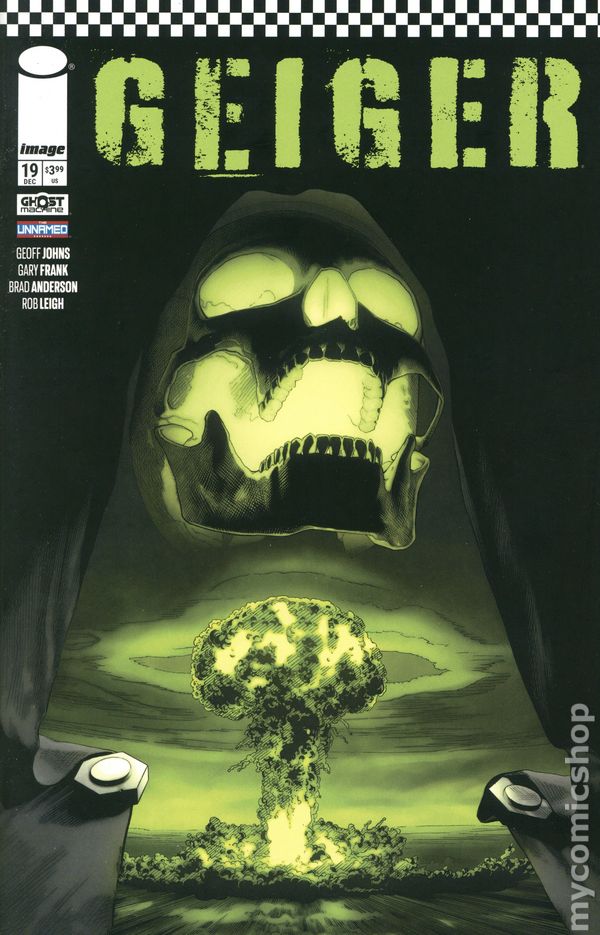 Written by Geoff Johns. Art by Gary Frank, Brad Anderson. Cover by Martin Morazzo, Chris O'Halloran. The first year of the hit ongoing GEIGER series ends with a nuclear showdown! As Geiger fails to take control of his explosive power surges, he must finally face the other Glowing Man! But this radioactive counterpart has a secret weapon that could destroy everything. Plus: Junkyard Joe and Nate the Nuclear Knight continue to uncover the secrets behind the Unknown War. 32 pages, full color. Rated T+ Cover price $3.99.