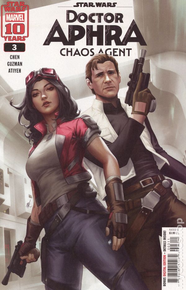 Written by Cherish Chen. Art by Gabriel Guzman. Cover by Chris Sprouse. THE DOCTOR AND THE SMUGGLER MEET AGAIN! The DAGGER agency teams up DOCTOR APHRA with the rebel hero and former smuggler HAN SOLO for a life-or-death mission! A prized piece of art must be returned to a gangster from HAN'S past! Can the doctor make it out in one piece?! 28 pages, full color. Rated T Cover price $3.99.