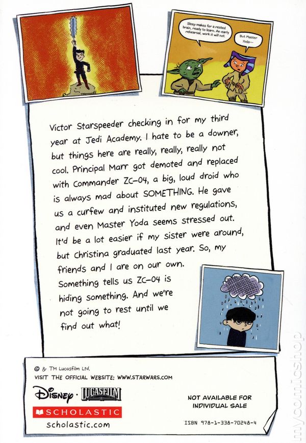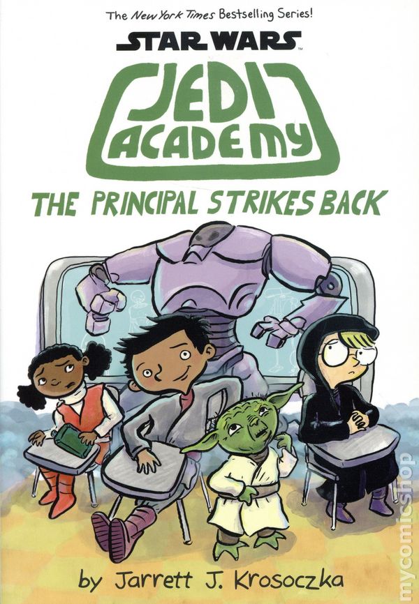 3rd Edition - 2nd and later printings. By Jarrett J Krosoczka. As told through a mix of comics, doodles, and journal entries, it's Victor Starspeeder's third year at Jedi Academy! It's also his first year ever without his sister, Christina. Plus, things at Jedi Academy are... weird. After last year's security breach, Principal Marr has been demoted and replaced with Commander ZC-04, a big, scary droid. There's a curfew, new regulations, and everyone is on edge. But when Victor and his friends dig a little deeper into the changes at the school, they find that there's a lot more to this story than the droids want to admit! It's an all-new, out-of-this-world Jedi Academy adventure as The Principal Strikes Back! Softcover, 5-in. x 7, 176 pages, , B&W.