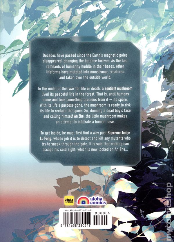 Volume 1 - 1st Printing - Postcards and Sticker Sheet NOT Included or Missing - Written by Yi Shi Si Zhou. Art and Cover by Yuchi Jinze and Maomao Tou. Decades have passed since the Earth's magnetic poles disappeared, changing the balance forever. As the last remnants of humanity huddle in their bases, the remaining lifeforms have mutated into so-called xenogens and taken over the outside world. In the midst of this war for life or death, a sentient mushroom lived his little life in the forest. That is, until humans came and took something precious from him — his spore. With his life's purpose gone, the young xenogen is ready to risk his life to reclaim it. So, donning a dead boy's face and calling himself An Zhe, the little mushroom makes an attempt to infiltrate a human base. To get inside, he must first get past the Supreme Judge Lu Feng, whose job it is to detect and kill any mutants who try to sneak through the gate. It is said that nothing can escape his cold sight, which is now locked on An Zhe! Hardcover, 6-in. x 8 1/2-in., 220 pages, B&W. MATURE READERS. Cover price $25.00.