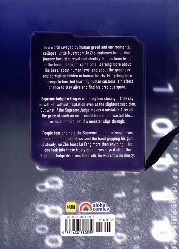 Volume 2 - 1st Printing - INCLUDES 2 bookmarks - Written by Yi Shi Si Zhou. Art and Cover by Yuchi Jinze and Maomao Tou. In a world ravaged by human greed and environmental collapse, Little Mushroom An Zhe continues his perilous journey toward survival and identity. He has been living in the human base for some time, learning more about the base, about human laws, and about the goodness and corruption hidden in human hearts. Everything here is foreign to him, but learning human customs is his best chance to stay alive and find his precious spore. Supreme Judge Lu Feng is watching him closely... They say he will kill without hesitation even at the slightest suspicion. But what if the Supreme Judge makes a mistake? After all, the price of such an error could be a single wasted life... or dozens more lost if a monster slips through. People fear and hate the Supreme Judge. Lu Fengs green eyes are cold and emotionless, and the hand gripping his gun is steady. An Zhe fears Lu Feng more than anything – just one look into those frosty green eyes says it all: if the Supreme Judge discovers the truth, he will show no mercy! Hardcover, 6-in. x 8 1/2-in., 212 pages, B&W. MATURE READERS. Cover price $25.00.