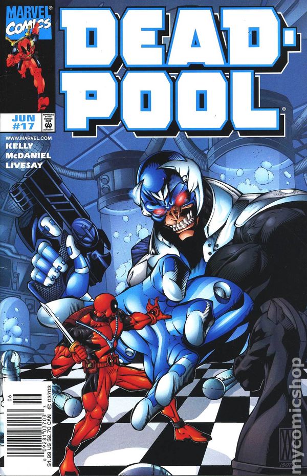 Cover pencils by Walter McDaniel, inks by John Livesay. Payback Part Two: The Quick and the Dead starring Deadpool, Blind Al, Dr. Killebrew (Death), Ilaney Brukner, Zoe Culloden, Monty, and Ajax, script by Joe Kelly, pencils by Walter McDaniel, inks by John Livesay and Sean Parsons; Deadpool has a final showdown with Ajax. Cover price $1.99.