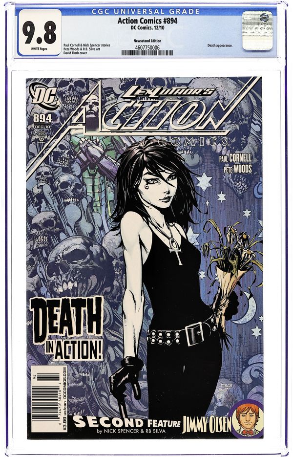 Newsstand Edition. Cover by David Finch and Matt Banning. Blackest Night Aftermath - The Black Ring: Part 5 - Written by PAUL CORNELL Co-feature written by NICK SPENCER Art by PETE WOODS Co-feature art by RB SILVA & DENIS FRIETAS Guest-starring Death from SANDMAN! Yes, you read that right! Death! From SANDMAN! In ACTION COMICS! Lex Luthor finds himself literally at Death's door, which leads to a fascinating look not only into the mind of one of the all-time greatest villains, but also at what Death means in the DC Universe... And in the JIMMY OLSEN co-feature, an alien race has chosen Metropolis to be the host of their millennial celebration! And who better to show them around town than James Bartholomew Olsen? But when the alien princess gets wasted and her brother starts picking bar fights, it's up to Jimmy to get things under control before all of Metropolis is destroyed! 44 Pages, Full Color. Cover price $3.99.