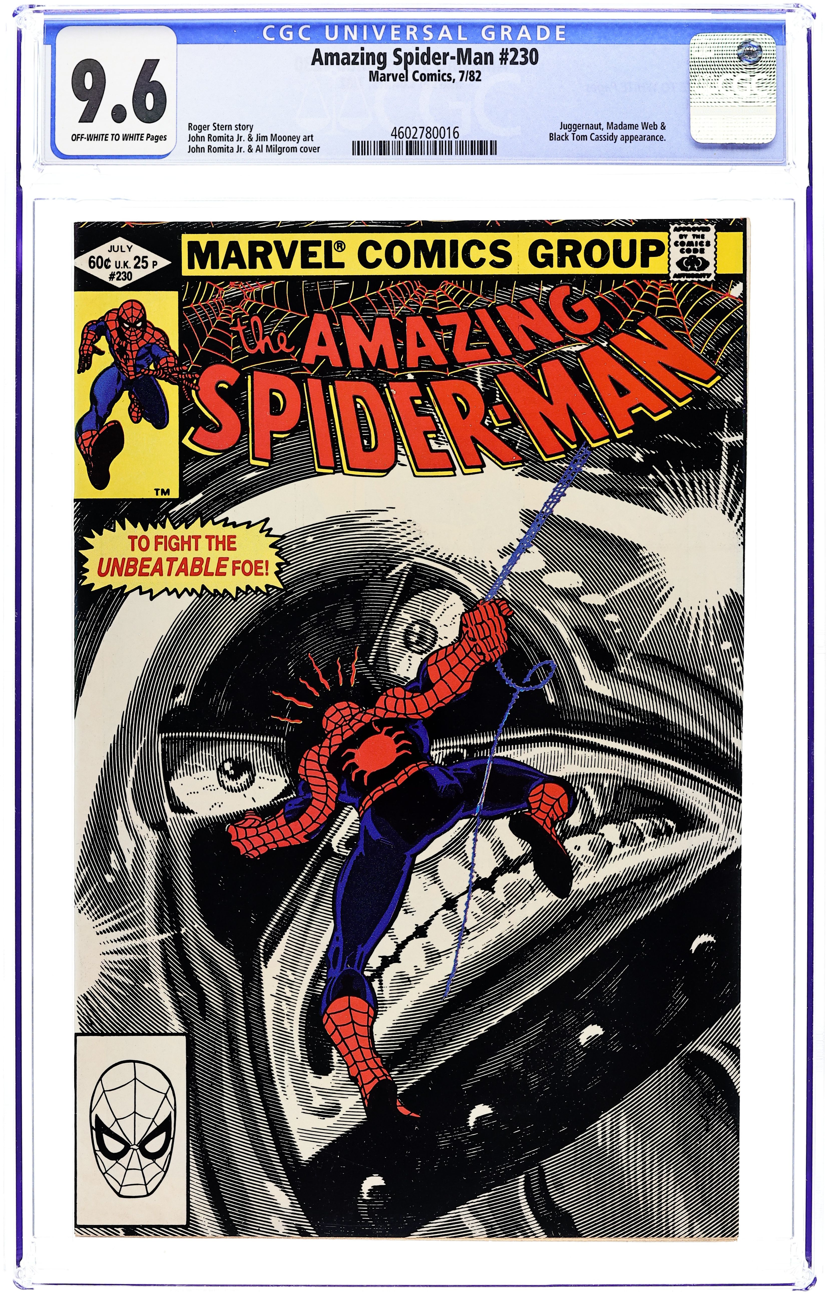 Direct Edition. To Fight the Unbeatable Foe!" Part 2 of 2. Script by Roger Stern. Art by John Romita Jr. (breakdowns) and Jim Mooney (finishes). Cover by John Romita Jr. and Al Milgrom. The Spectacular Spider-Man and the Juggernaut battle from cover to cover across New York City! The web-slinger is furious after the Juggernaut ripped Madame Web out of her life support chair last issue! And with his clairvoyant friend now lying in a coma, the fighting mad wall-crawler vows to do whatever it takes to defeat his invincible foe! Spider-Man throws steel girders, wrecking balls, gasoline trucks, and the proverbial kitchen sink at the Juggernaut! But nothing works! Is there any way to stop the indestructible brute? Your friendly neighborhood Spider-Man will find it or die trying! (Notes: The Juggernaut returns in Uncanny X-Men 183. He clashes with the wall-crawler again in Marvel Team-Up 150. Madame Web appears next in Amazing Spider-Man 239.) 36 pgs. Cover price $0.60.