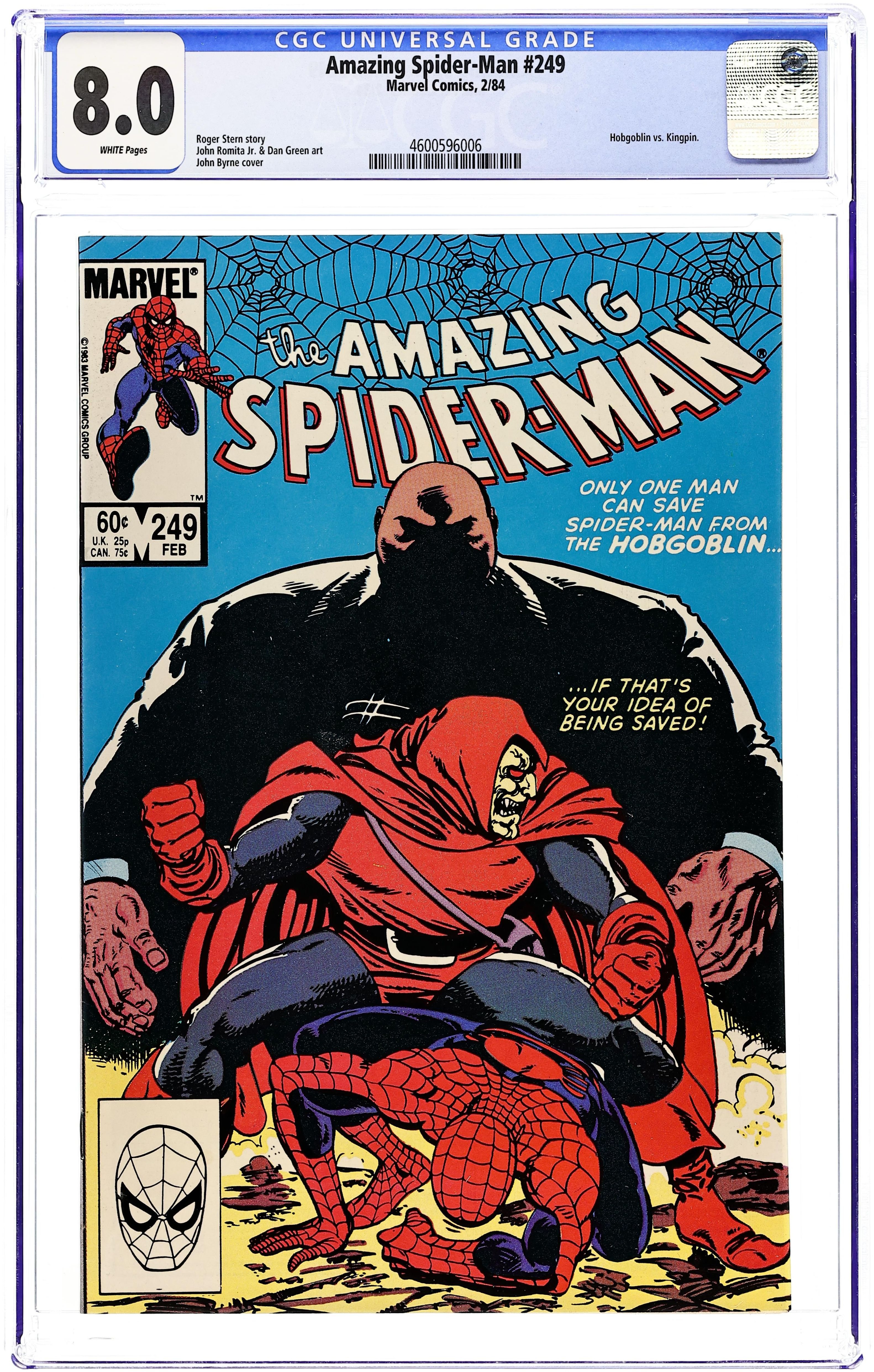 Direct Edition. "Secrets!" Part 1 of 3. Script by Roger Stern. Art by John Romita Jr. (breakdowns) and Dan Green (finishes). Cover by John Byrne. A mysterious individual is blackmailing the movers and shakers of New York City! And the group of victims includes Harry Osborn and J. Jonah Jameson! At the prestigious century club in Manhattan, the distinguished businessmen assemble to meet their tormentor...the Hobgoblin! The goblin plans to make his prey squirm in their seats! But there happens to be two other men relaxing at the club this afternoon...Mr. Wilson Fisk and Mr. Peter Parker! Perhaps better known as the Kingpin and the Amazing Spider-Man! Wow, is a three-way throw down about to erupt? Retelling of the Green Goblins origin. Cameo appearance by Mary Jane Watson. Flashback cameos by Norman Osborn and the Scorpion. (Note: This three-part story was reprinted in the 1992 trade paperback: The Origin of the Hobgoblin; and the 2011 trade paperback also titled: The Origin of the Hobgoblin.) 36 pgs. Cover price $0.60.