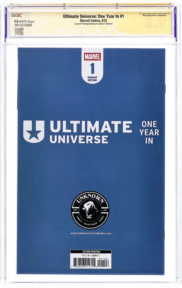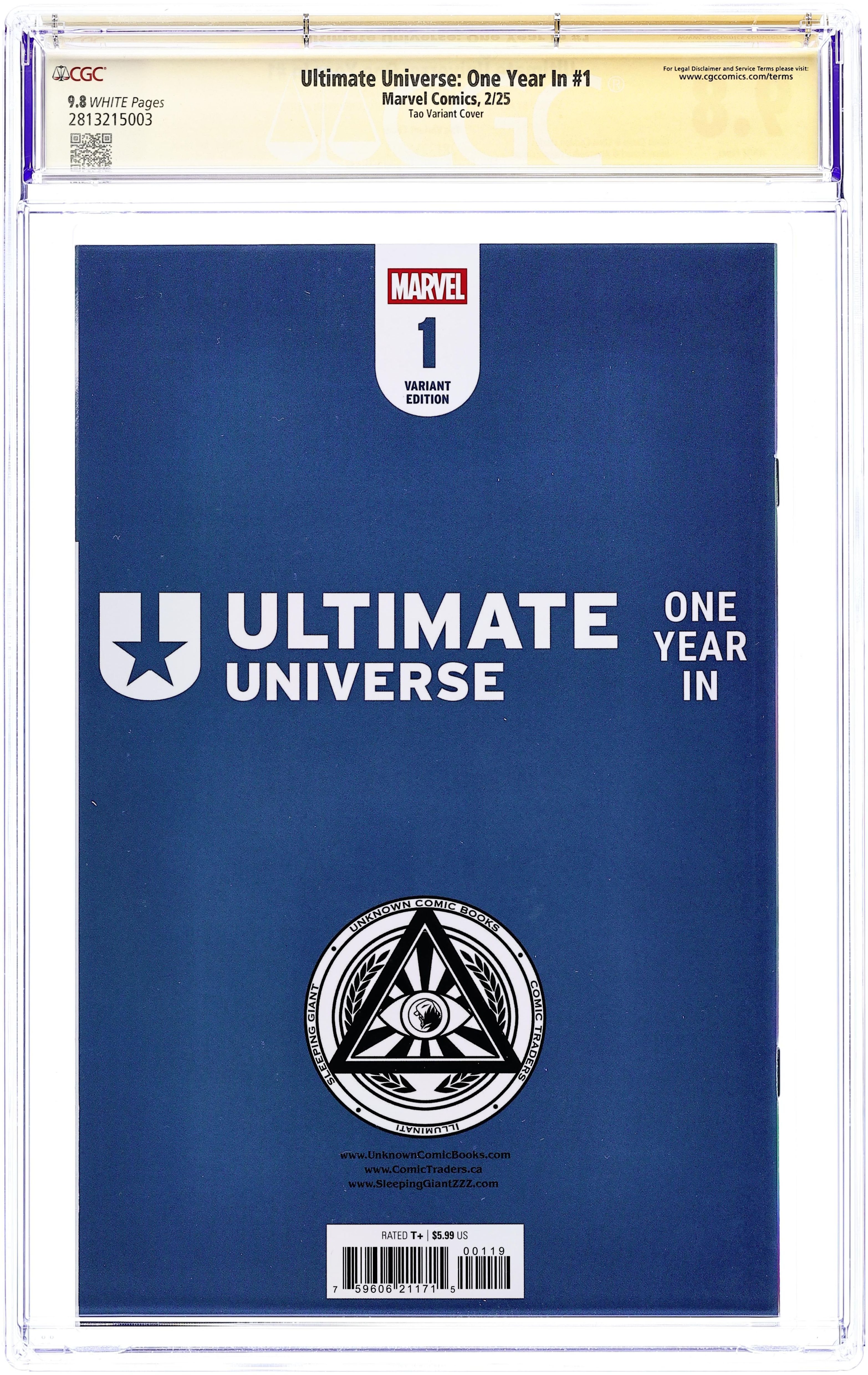 Second Printing. Unknown Comic Books Exclusive Virgin Cover by Ivan Tao. Written by Deniz Camp; Christopher Condon. Art by Jonas Scharf; Alessandro Cappuccio. THE CLOCK IS TICKING DOWN TO THE MAKER'S ARRIVAL! Deniz Camp flips the narrative on ULTIMATES and takes us inside the Maker's Council! The heroes of the Ultimate Universe aren't the only ones who have been preparing for the return of the Maker, and the clock is ticking down… This unique one-shot sets the stage for the second year of the Ultimate line and includes the debut of the Ultimate versions of two major Marvel characters! 40 pages, full color. Rated T+ Cover price $5.99.