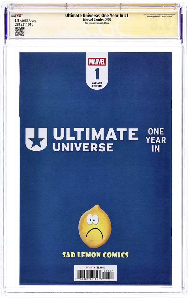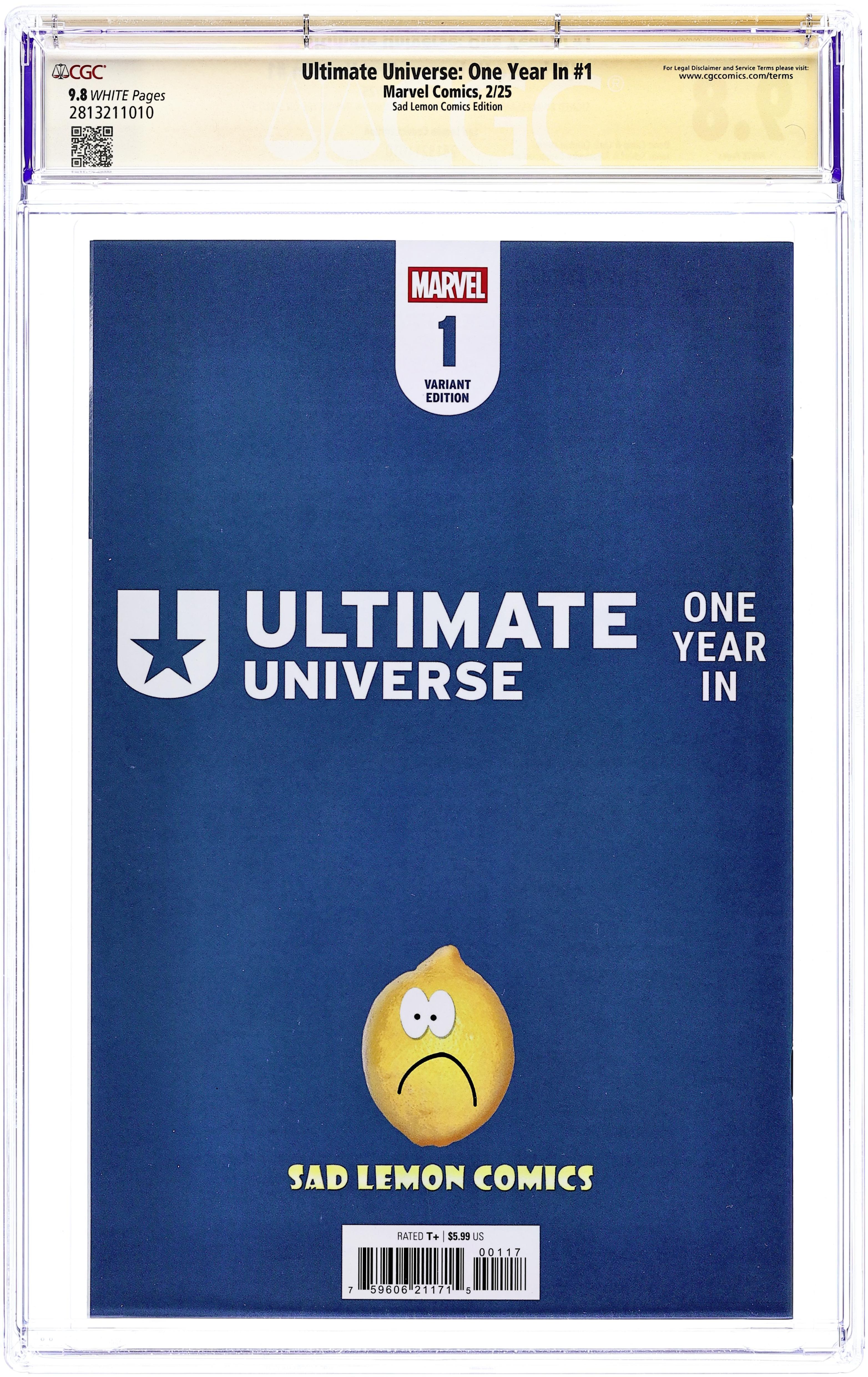 Sad Lemon Comics Exclusive Variant Cover by InHyuk Lee. Written by Deniz Camp; Christopher Condon. Art by Jonas Scharf; Alessandro Cappuccio. THE CLOCK IS TICKING DOWN TO THE MAKER'S ARRIVAL! Deniz Camp flips the narrative on ULTIMATES and takes us inside the Maker's Council! The heroes of the Ultimate Universe aren't the only ones who have been preparing for the return of the Maker, and the clock is ticking down… This unique one-shot sets the stage for the second year of the Ultimate line and includes the debut of the Ultimate versions of two major Marvel characters! 40 pages, full color. Rated T+ Cover price $5.99.