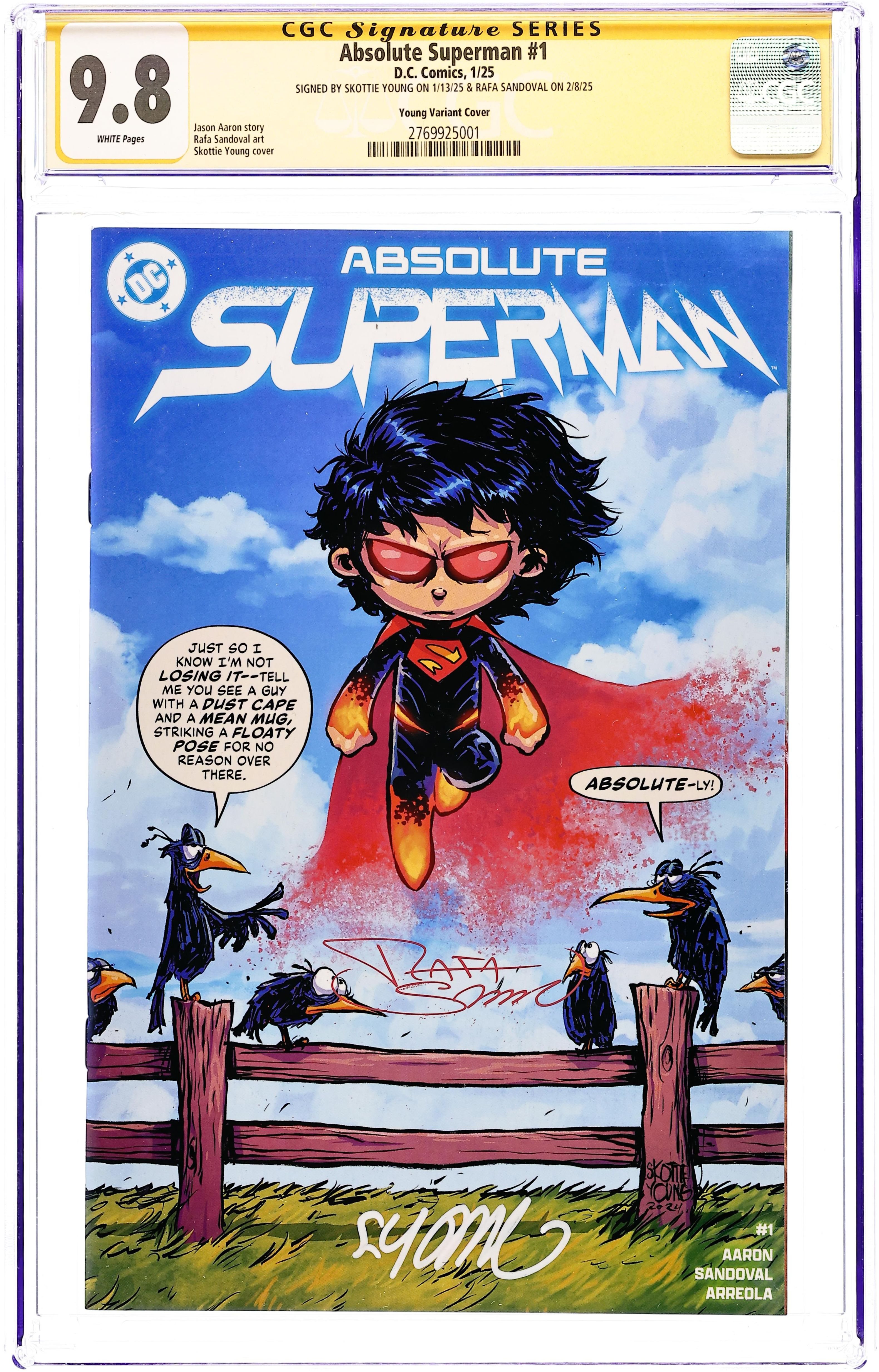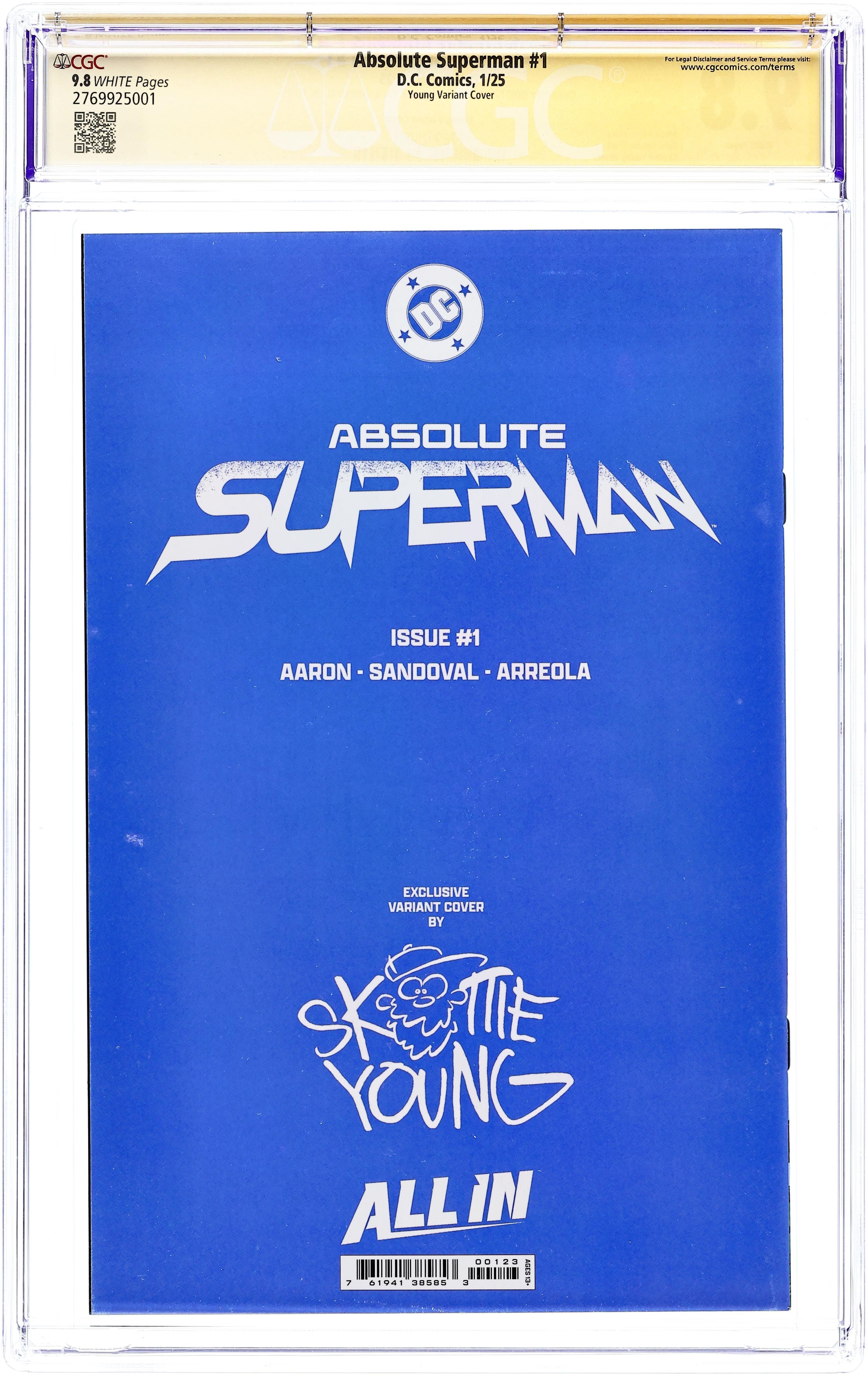 Webstore Exclusive Variant Cover by Skottie Young. Written by Jason Aaron. Art by Rafa Sandoval. SUPERSTARS JASON AARON AND RAFA SANDOVAL UNLEASH A SHOCKING NEW TAKE ON THE LAST SON OF KRYPTON! Without the fortress...without the family...without a home...what's left is the Absolute Man of Steel! 48 pages, full color. Rated T+