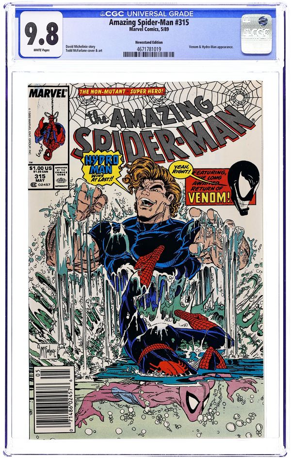 Direct Edition. "A Matter of Life and Debt!" Script by David Michelinie. Art by Todd McFarlane. Cover by Todd McFarlane. Life is full of challenges and on this day Peter Parker and his web-spinning alter-ego face three! The first, Hydro-Man attempts a payday robbery! But the Spectacular Spider-Man stops the heist! The second, Nathan Lubensky steals money from Aunt May to pay his gambling debts! However, Peter quickly shuts down his operation! And the fateful third...Venom escapes from the Vault! Wow, this challenge will be more difficult and more deadly starting next issue! Cameo appearances by Mary Jane Watson and Kristy Watson. (Notes: Venom previously appeared in Amazing Spider-Man 300.) The letters page contains a statement of ownership: average print run 451,930; average paid circulation 271,100. 36 pgs. Cover price $1.00.