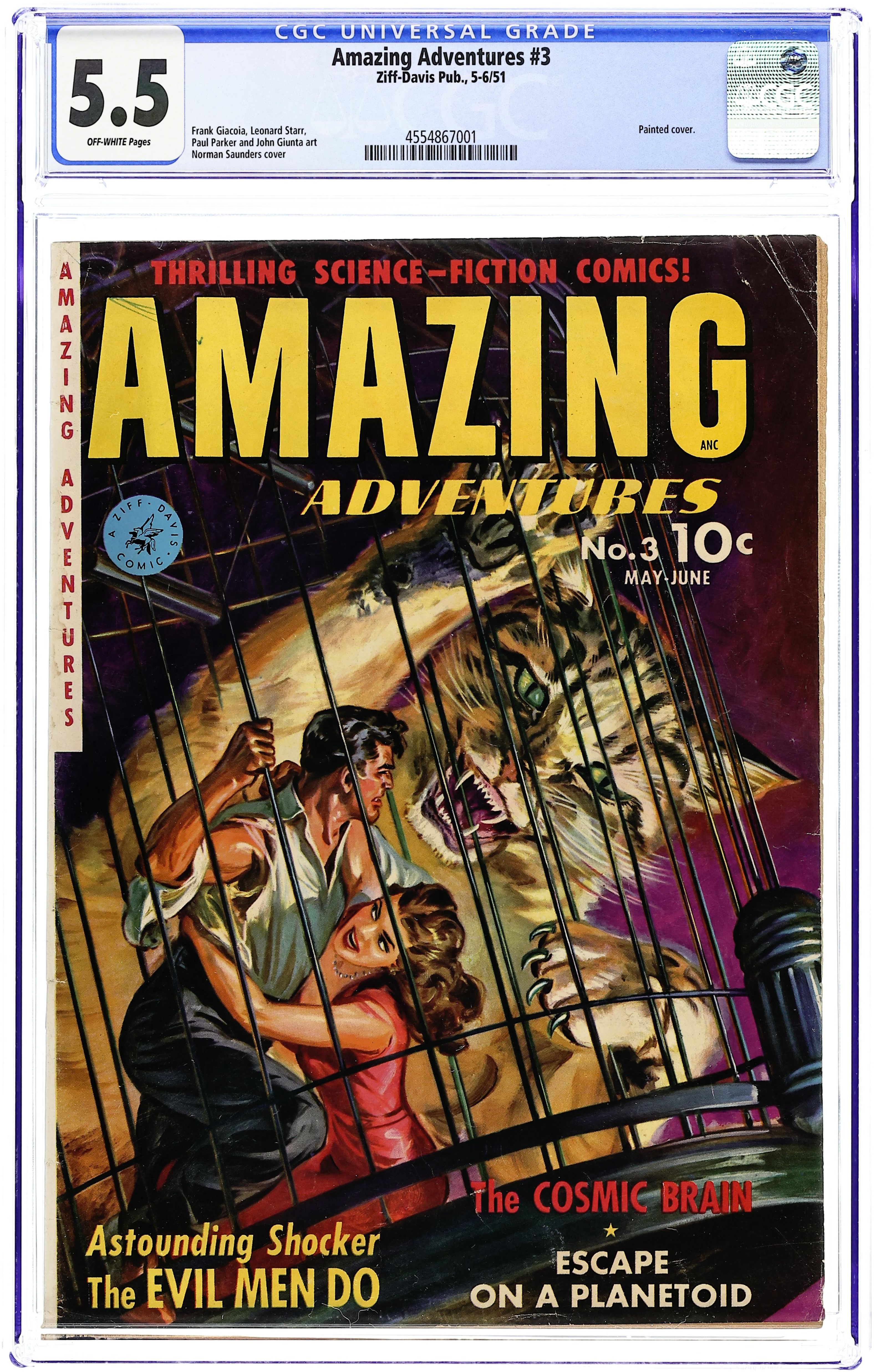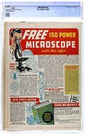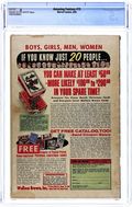 Painted cover by Norman Saunders. Stories and art by Leonard Starr, Frank Giacoia, John Giunta and Paul Parker. Sci-fi and fantasy from Ziff-Davis, edited by the legendary co-creator of Superman, Jerry Siegel. Brad is jealous of Chet for stealing Nina, so he shrinks all three of them with his shrinking invention... but he didn't reckon on the housecat. WWII vet John gets the chance to trade places with his exact duplicate from the year 3951. Col Rulak leads a revolt against the totalitarian world government of "Europa" in the year 2200. A gigantic, floating Cosmic Brain menaces the city. Painted cover by Norman Saunders predates The Incredible Shrinking Man. The Evil Men Do; The Princess of the Future; Blood Stands for Freedom; The Cosmic Brain!; Escape on a Planetoid; The Steel Monster. 32 pages, Full Color. Cover price $0.10.