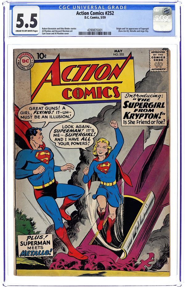 Cover pencils by Curt Swan, inks by Al Plastino. Origin and 1st appearance of Supergirl in "The Supergirl from Krypton!", script by Otto Binder, art by Al Plastino; Superman spies a crashing rocket and discovers his cousin Supergirl; She tells him how Argo City survived the destruction of Krypton and how her father sent her to Earth when the inhabitants of Argo City were threatened by Kryptonite poisoning; Superman sets her up in Midvale Orphanage so she can adjust to life on Earth. Intro new Metallo "The Menace of Metallo!", script by Robert Bernstein, art by Al Plastino; Criminal John Corben, who is nearly killed in an auto accident, is given a robot body powered by uranium; When he is hit by bullets meant for Lois, she assumes he is really Superman. 2/3-page Little Pete story by Henry Boltinoff. "Congo Bill Dies at Dawn!", script by Robert Bernstein, art by Howard Sherman. 36 Pages, Full Color. $.10 Cover price $0.10.