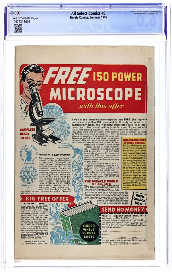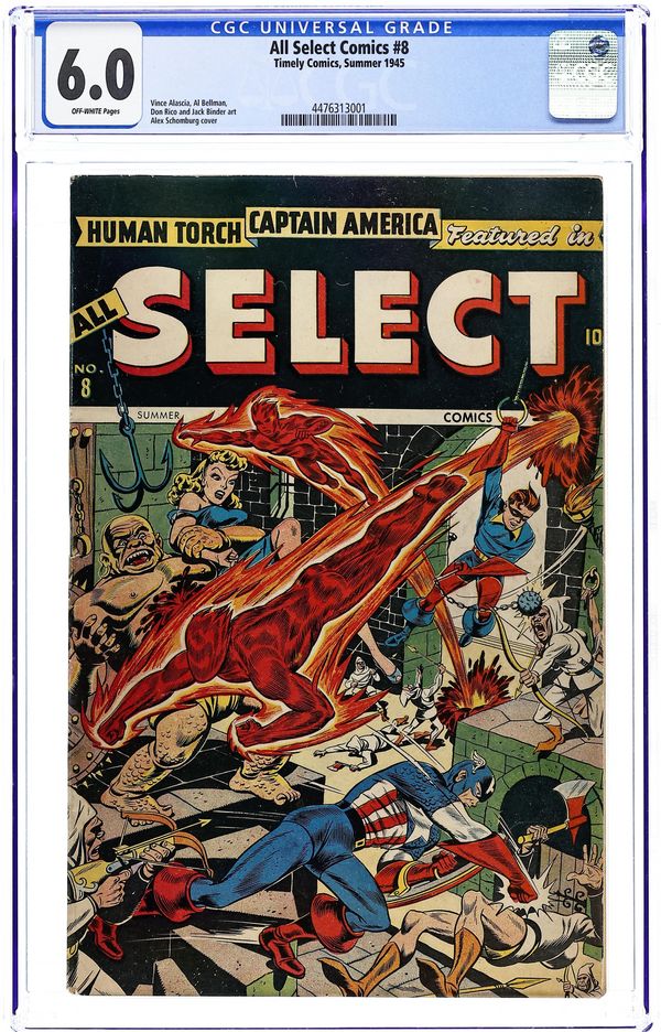 Cover art by Alex Schomburg. The China Wall Mystery starring Captain America, pencils by Vince Alascia, inks by Al Bellman; Steve Rogers and Bucky are stationed at the Great Wall of China when they come across a Jap plot to bypass Chinese garrisons by using hollowed out interior tunnels within the wall; Cap and Bucky meet a mysterious old Chinese man who gives them aid against the Japanese troops. Death Cargo starring Human Torch, pencils by Al Bellman, inks by Jack Binder. Air Base starring Jap Buster Johnson, pencils by Al Bellman, inks by Don Rico. 36 pgs. $0.10. Cover price $0.10.