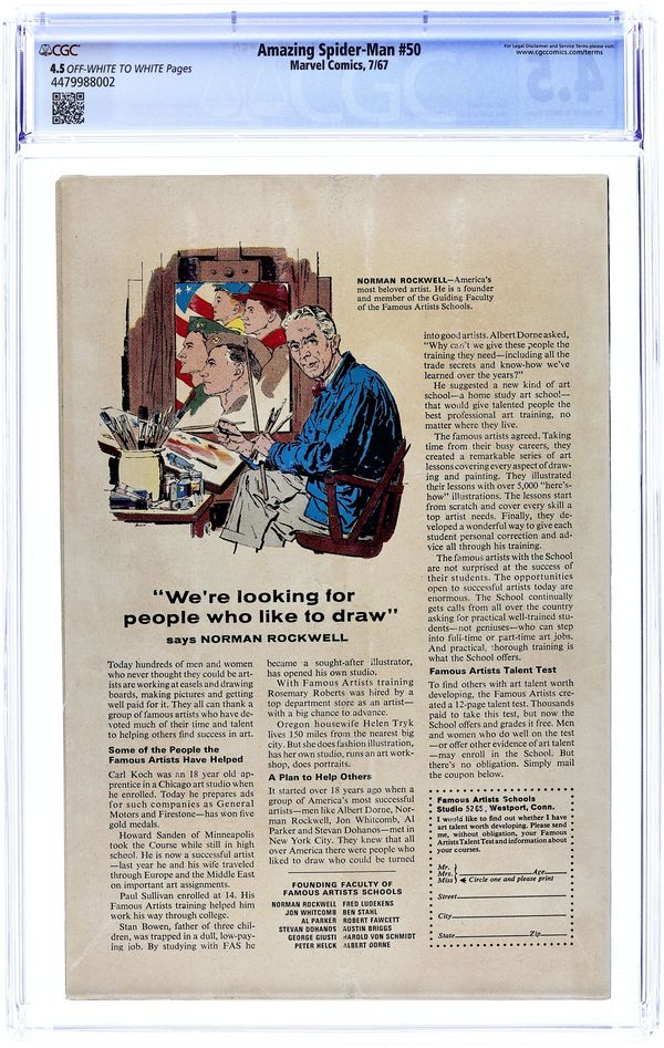 Cover art by Steve Ditko. First appearance of the Green Goblin (Norman Osborn) in The Grotesque Adventure of the Green Goblin!, script by Stan Lee, art by Steve Ditko; The Green Goblin hires the Enforcers to help him defeat Spider-Man; To further his plan he convinces B.J. Cosmos to film a movie of Spider-Man fighting Goblin and the Enforcers in the desert; While filming, Goblin and the Enforcers attack Spider-Man and accidentally awaken the Hulk. Reprinted in Marvel Tales # 9 and 152. 36 pgs. $0.12. Cover price $0.12.