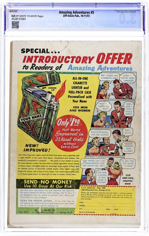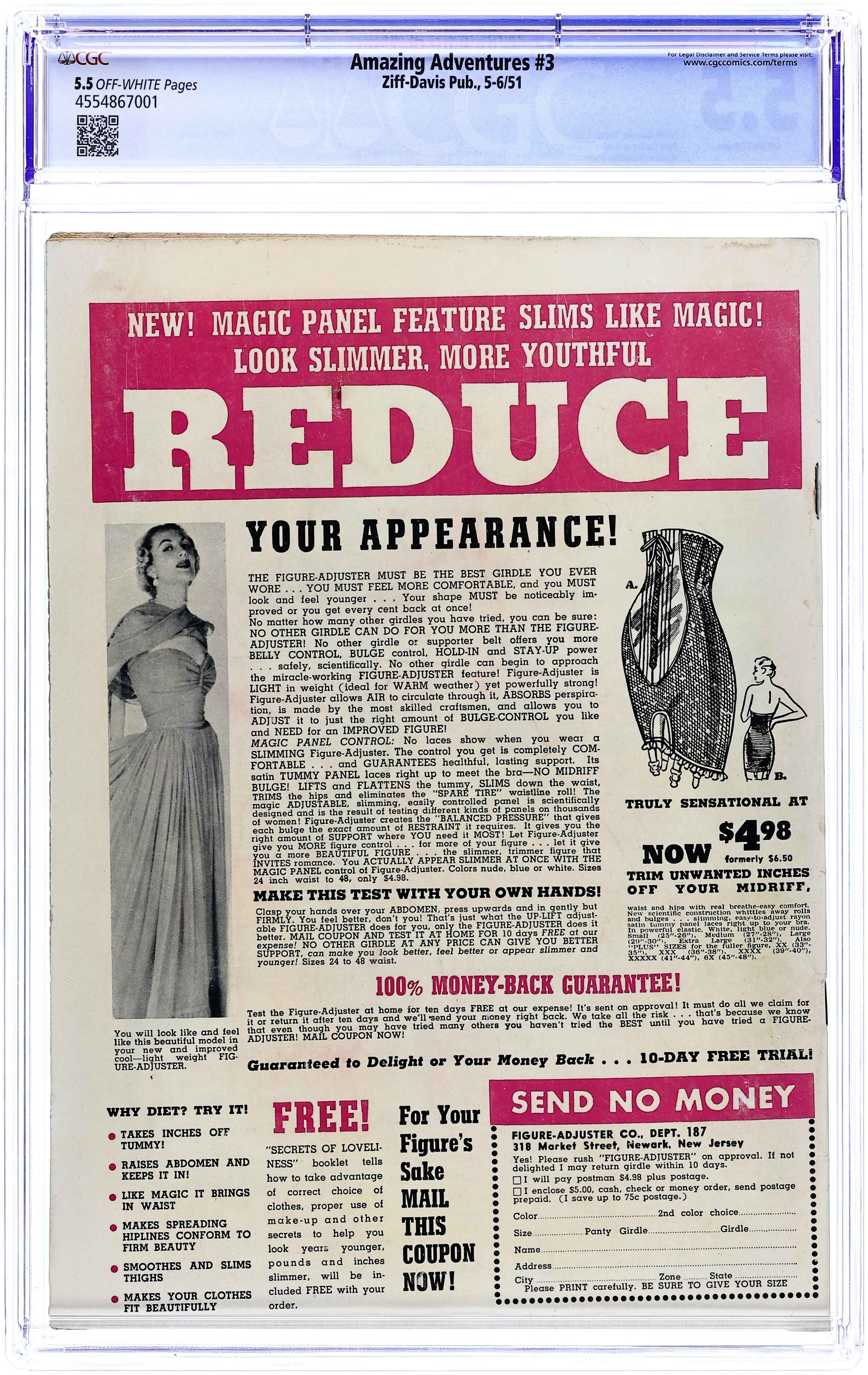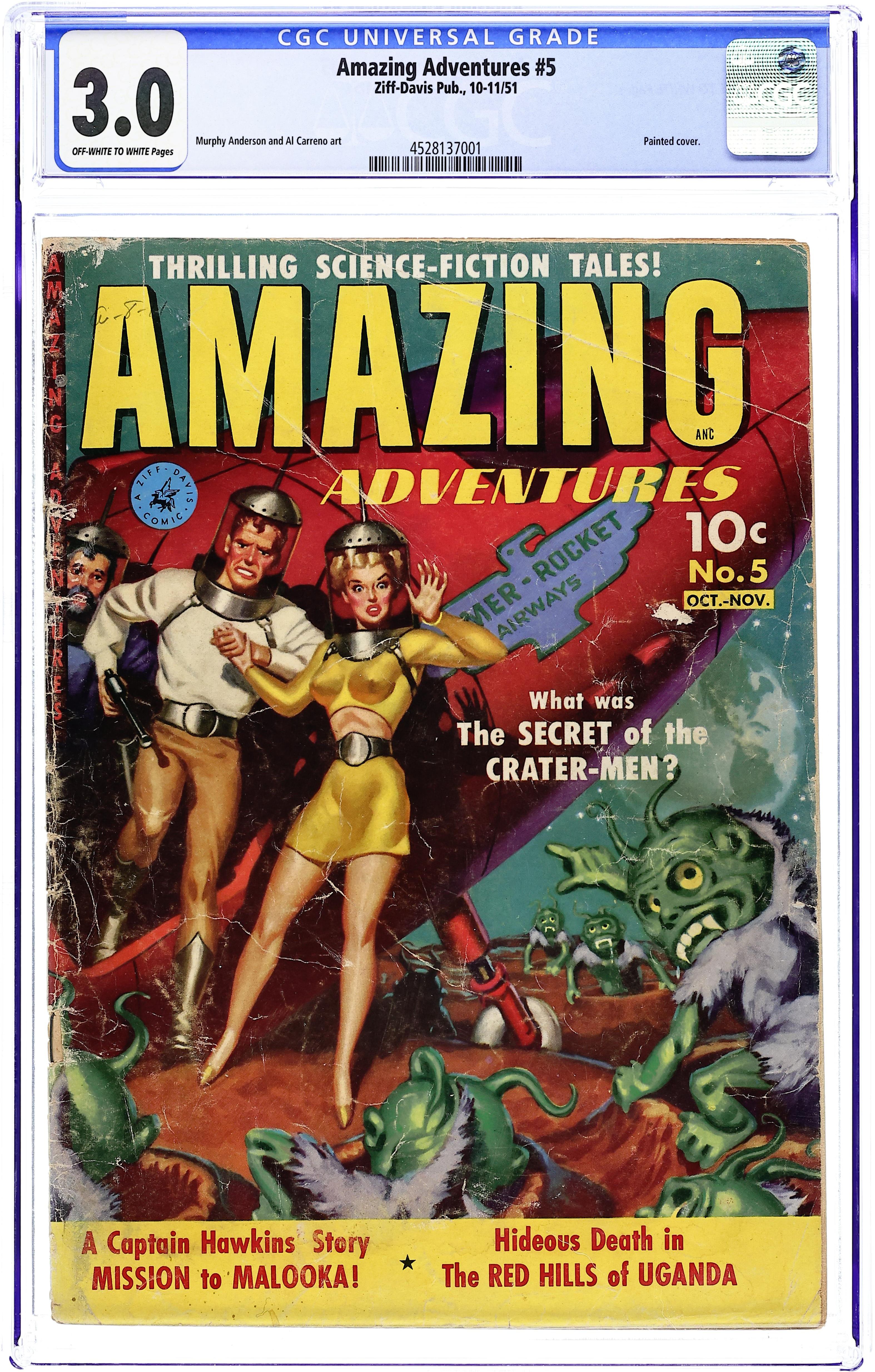 Painted cover by Allen Anderson. Stories and art by Murphy Anderson, Don Perlin, and Al Carreno. Sci-fi and fantasy from Ziff-Davis, edited by the legendary co-creator of Superman, Jerry Siegel. Marta and Frank venture into the African jungles to find her father, and unleash the residents of a gigantic anthill. Captain Martin Hawkins has Star Trek-like adventures and drama in space, in a story with art by comics legend Murphy Anderson. Plus a one-pager with early art by future Marvel legend Don Perlin. Fun painted cover by Allen Anderson has all the requisite elements of a Golden Age sci-fi cover. Martin Hawkins: Mission to Malooka; The Secret of the Crater-Men; Rockets Are Old Stuff!; Cosmic Creeps; What the Atom Can Do for Peace!; The Red Hills of Uganda; Yuff-Yuff. 32 pages, Full Color. Cover price $0.10.