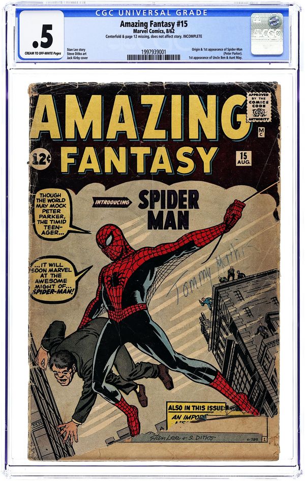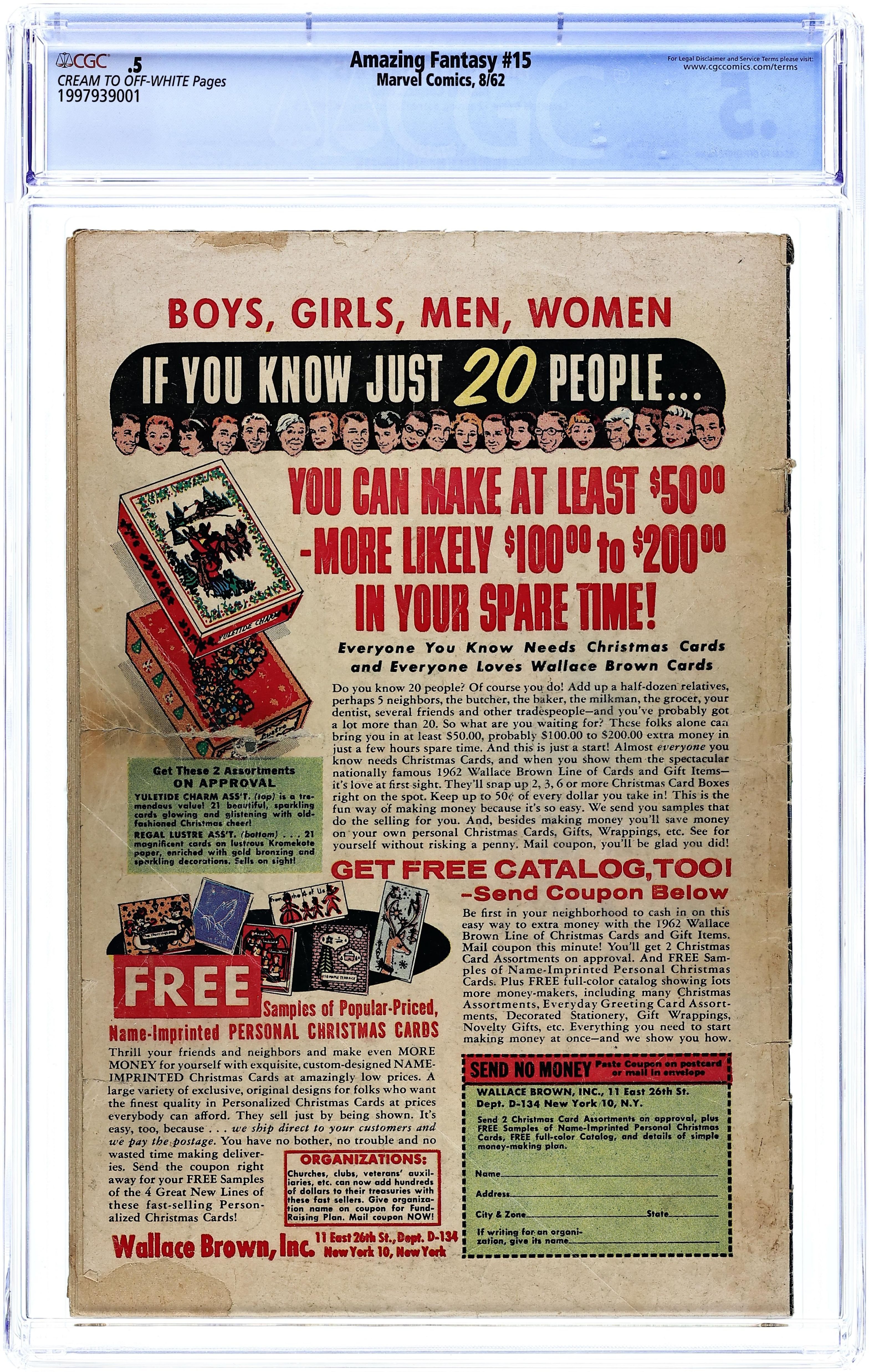 Origin and 1st Appearance of Spider-Man by Stan Lee and Steve Ditko (11pgs). 1st appearance of Aunt May and Uncle Ben. Cover pencils by Jack Kirby, inks by Steve Ditko. "Spider-Man!", script by Stan Lee, art by Steve Ditko; Peter Parker is bitten by a radioactive spider and gains the abilities of a spider; When he fails to stop a burglar who runs past him, his uncle is killed as a result; He therefore swears never to shirk his responsibility again. "The Bell-Ringer!", script by Stan Lee, art by Steve Ditko; On a small Mediterranean island of fisherfolk, Old Pedros is the town bell-ringer; One day the volcano atop the island begins to erupt; The villagers evacuate and put out to sea; Old Pedros, though, stays at the church; "The bells must be rung," he tells himself. "Man in the Mummy Case!", script by Stan Lee, art by Steve Ditko; A fugitive accepts a mummy's help to escape the police, only to find himself an ancient Egyptian slave. Stan Lee's editorial explaining title change. "There Are Martians Among Us!", script by Stan Lee, art by Steve Ditko; The discovery of a crashed flying saucer frightens a small town, especially when the townspeople realize that the Martians are among them; A month goes by with the aliens still at large. 36 pgs., full color. Cover price $0.12.