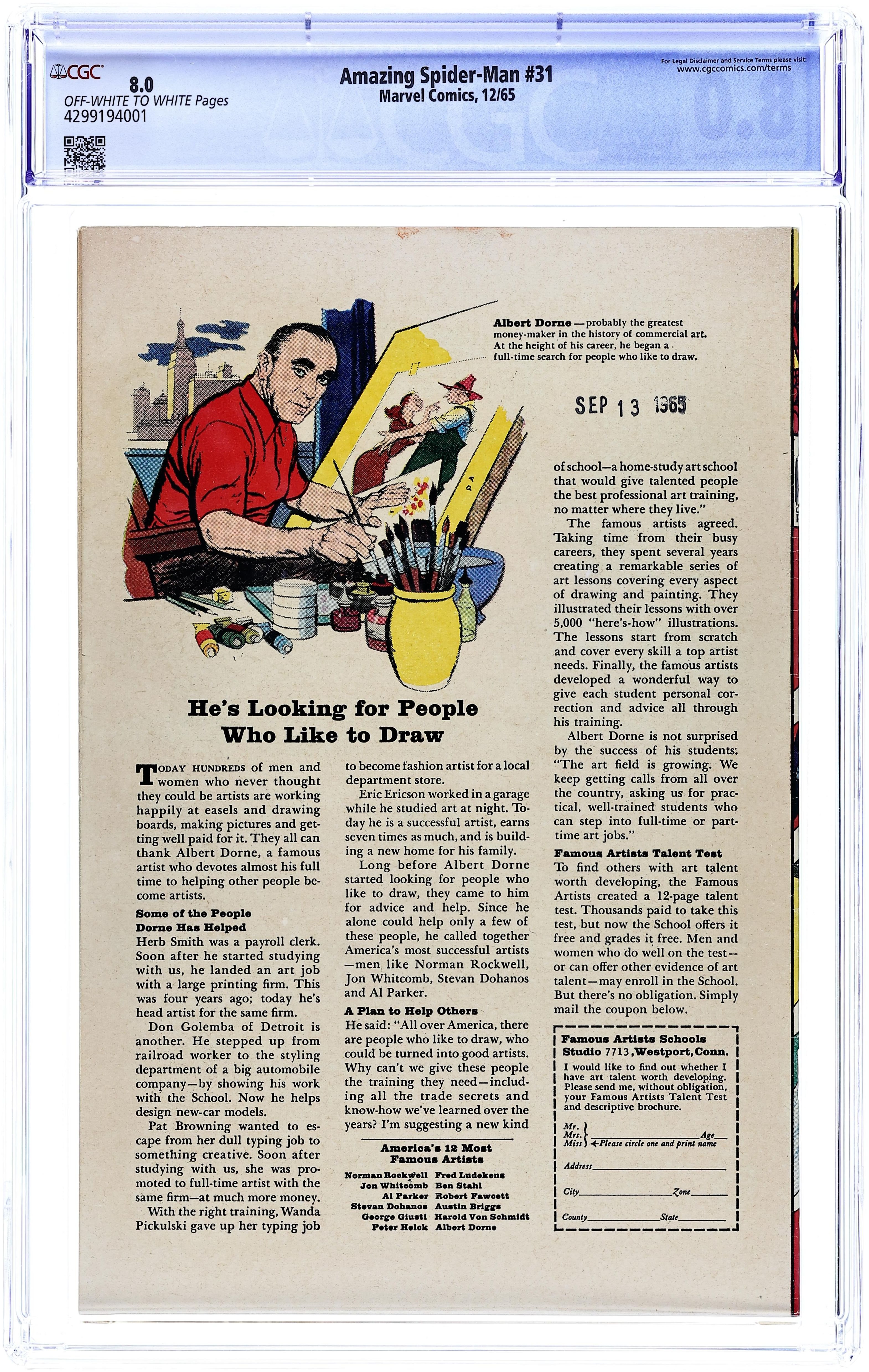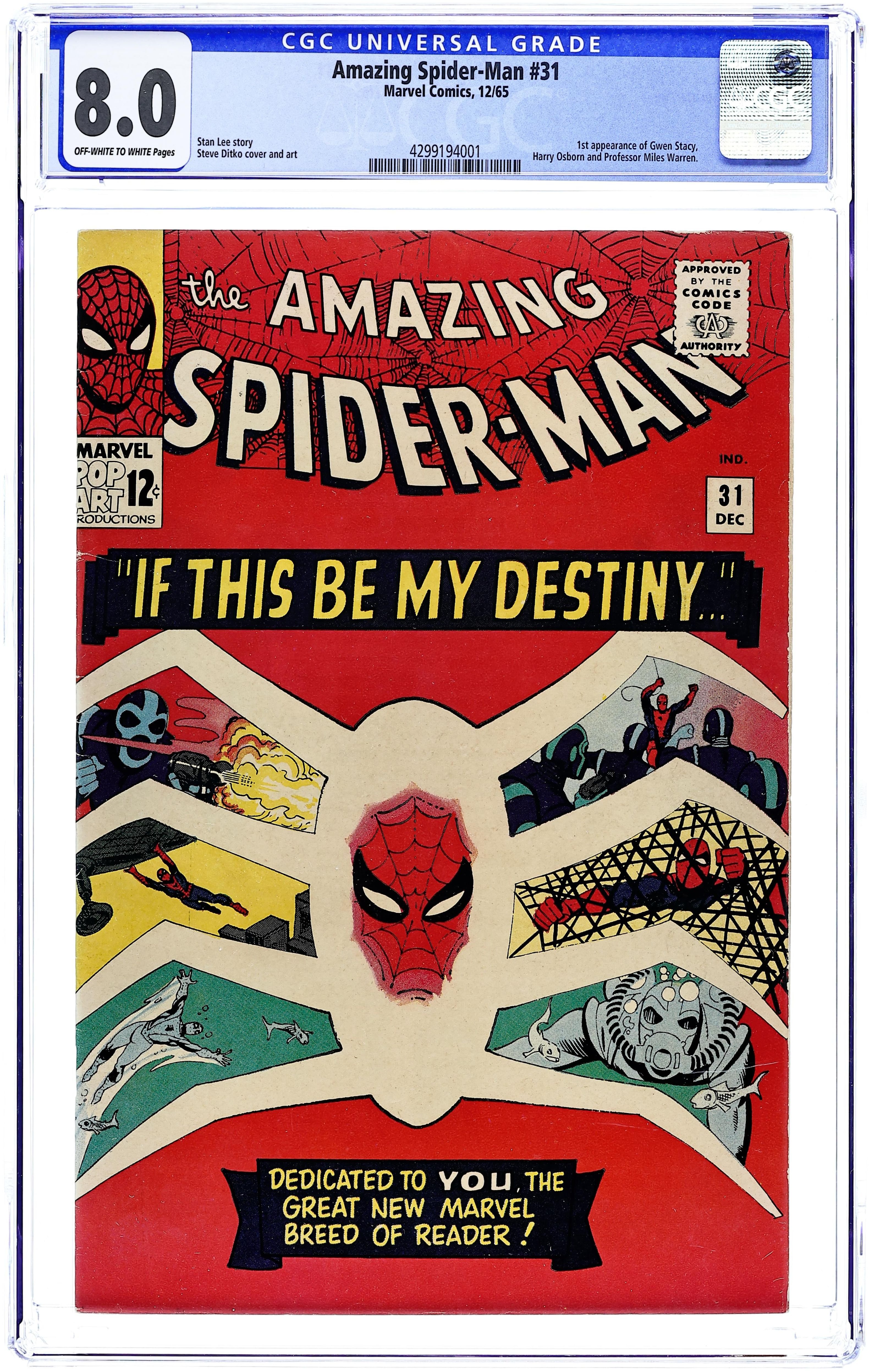 Cover by Steve Ditko. First appearances of Gwen Stacy, Harry Osborn, and Professor Warren. First appearance of the Master Planner (revealed in issue 32 to be Doctor Octopus) in "If This Be My Destiny, script by Steve Ditko (plot) and Stan Lee (script), art by Steve Ditko; Aunt May falls deathly ill on Peter's first day of college. Meanwhile, the Master Planner is stealing scientific gadgets. Marvel Bullpen Bulletins, art by Steve Ditko and Marie Severin; Bullpen Bulletins page discussing staff; Marvel Checklist; ads for Spider-Man T-Shirt and MMMS. Letter to the editor from comics writer Don McGregor. Reprinted in Marvel Tales # 24 and 170. 36 pgs., full color. $0.12. Cover price $0.12.