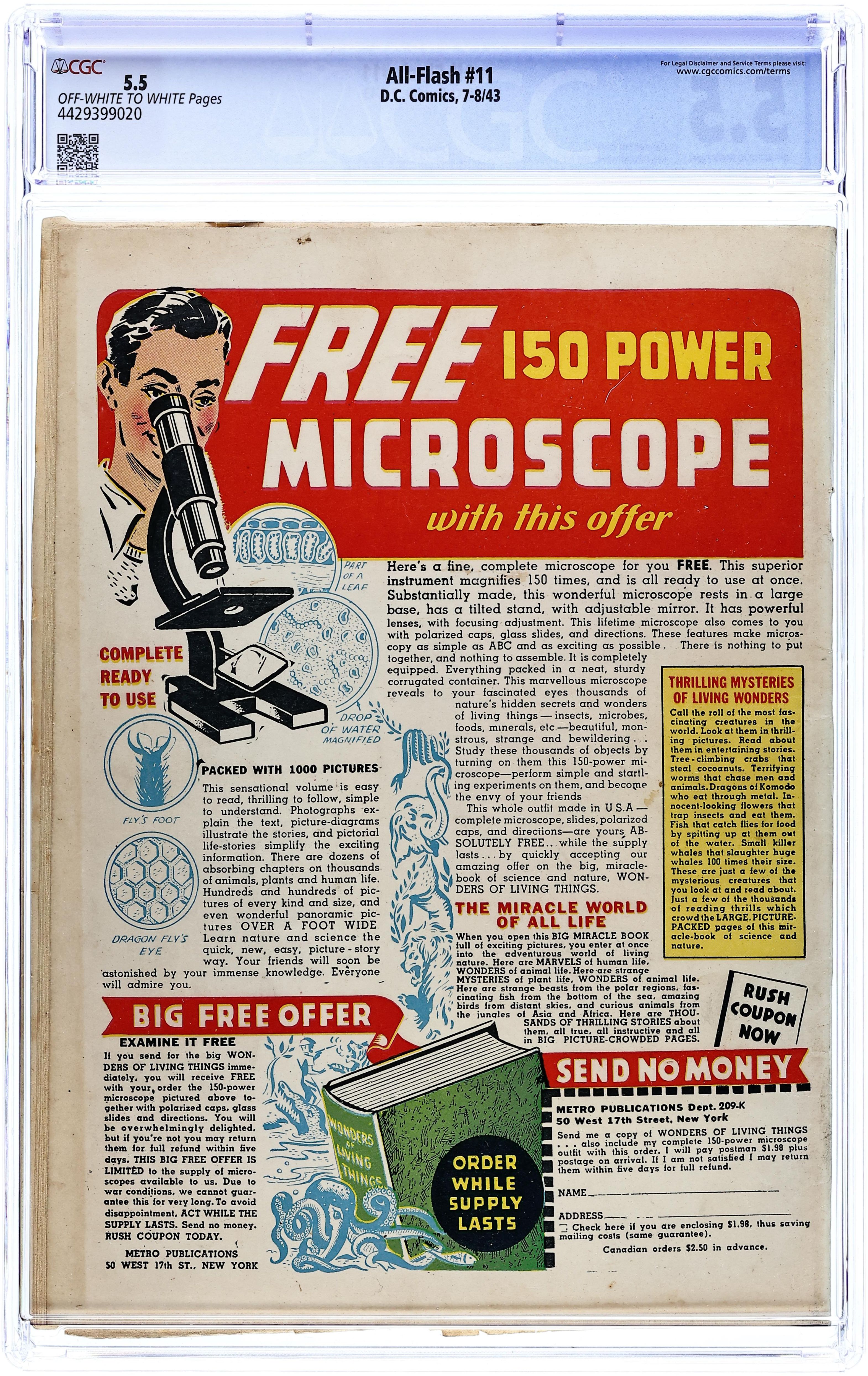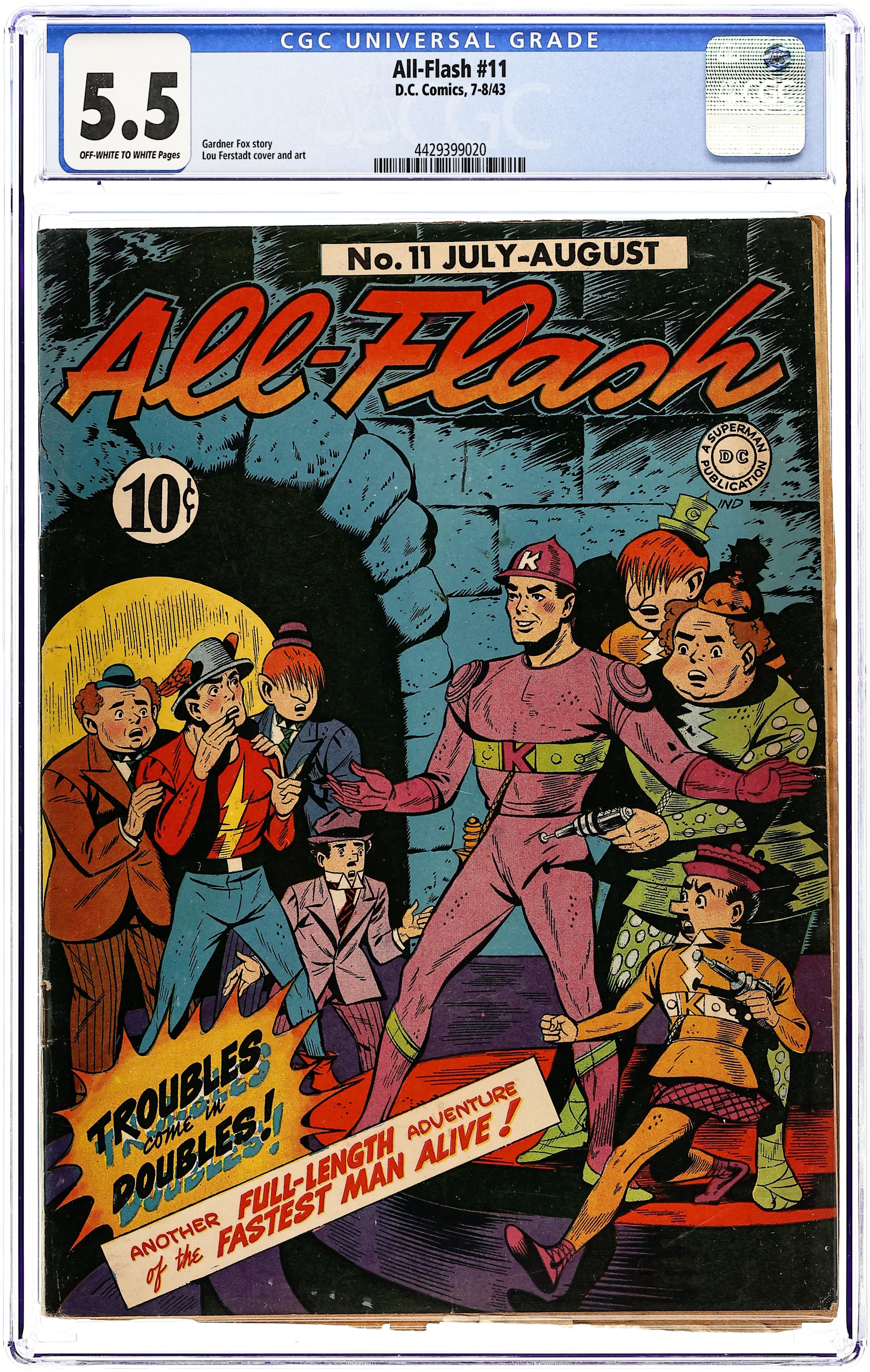 Written by Gardner F. Fox. Art and cover by Lou Ferstadt. A man and a woman, identical to Jay Garrick and Joan Williams in appearance, arrive from the planet Karma looking for three escaped convicts who bear a striking resemblance to the Three Dimwits. Unfortunately, the Flash confuses these crooks with the real Dimwits, who are working for a genius professor. Fat and Slat humor page by Ed Wheelan. Hop Harrigan text story by Evelyn Gaines. 60 Pages, Full Color. Cover price $0.10.