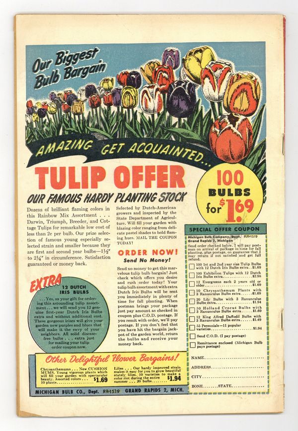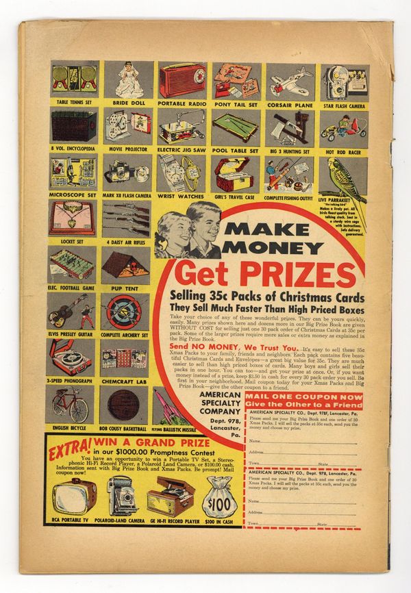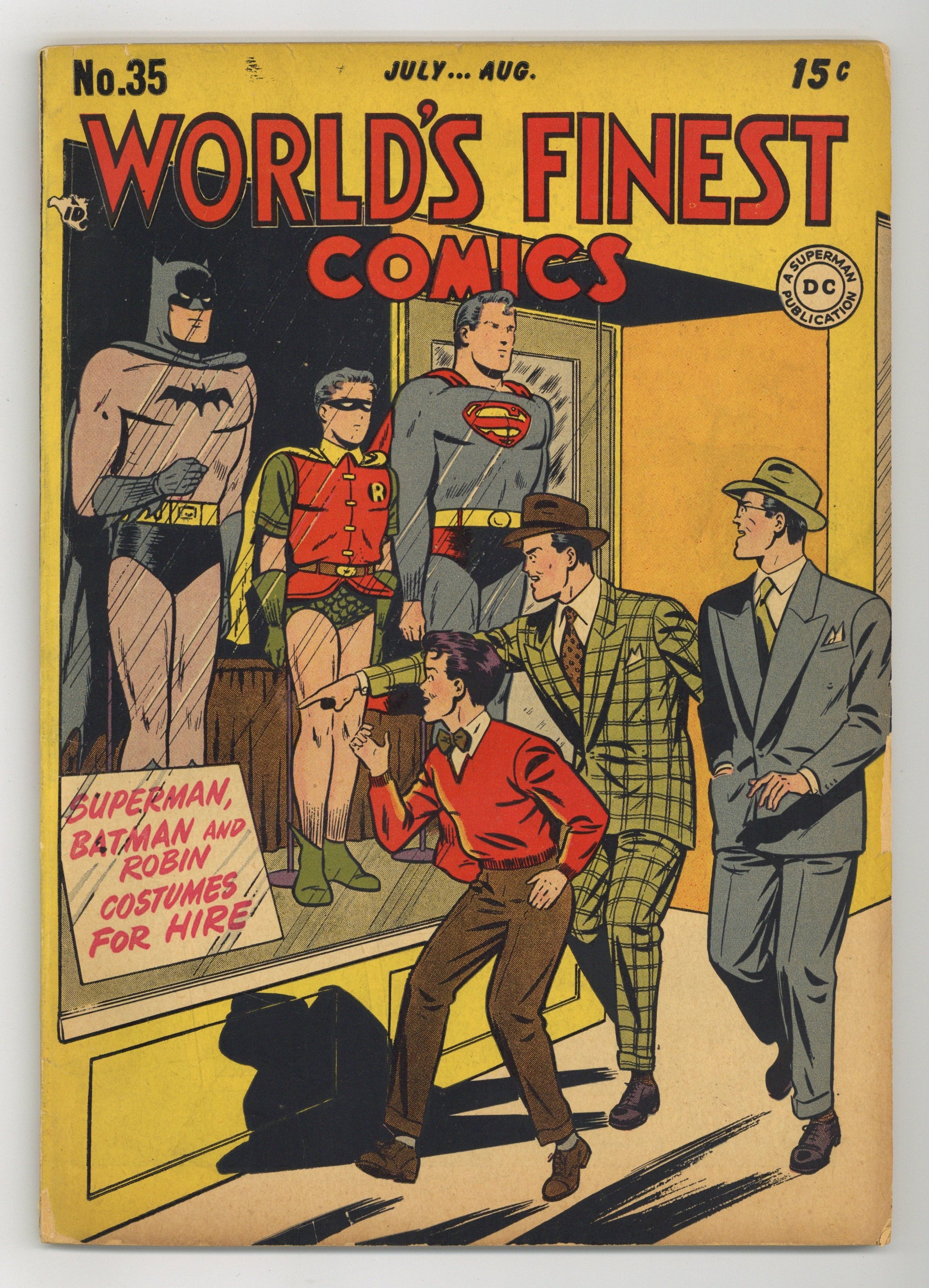 Cover art by Win Mortimer. Daddy Superman, pencils by Wayne Boring; Twin babies are accidentally left on Clark Kent's doorstep. The Freedom Press starring Tomahawk, Tom Paine, and Ben Franklin, art by Fred Ray. The Bravest Man In The World starring Boy Commandos, script by George Kashdan, pencils by Curt Swan. The Bow Fails Green Arrow starring Green Arrow, script by George Kashdan, art by George Papp. The Tattooed Crook starring Zatara, script by Joe Samachson, art by William F. White. Crime By The Book starring Batman and Penguin, script by Edmond Hamilton, pencils by Bob Kane, inks by Ray Burnley. One-page Tootsie Roll ad, Captain Tootsie Traps the Circus Culprit by C.C. Beck. 76 Pages, Full Color. Cover price $0.15.