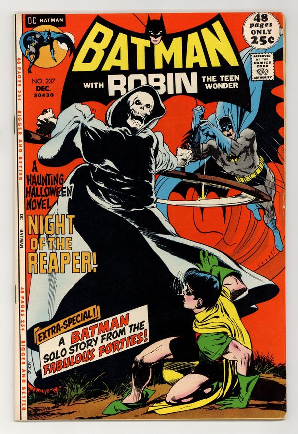Starts Dec 15 Cover by Neal Adams. "Night of the Reaper!", script by Denny O'Neil, pencils by Neal Adams inks by Dick Giordano; Dick Grayson attends the annual Vermont parade on Halloween with some of his college friends; The notice some crooks attacking a man dressed as Robin and try to help him; The Reaper attacks Robin; Batman, who has been tracking an ex-Nazi war criminal to the parade, finds Robin and takes him to the house of Tom Fagan, the parade organizer. A letter from Denny O'Neil who recounts the real life events that inspired "Night of the Reaper." "The Screaming House," script by Bill Finger, pencils by Bob Kane and Jerry Robinson (backgrounds), inks by Bob Kane; While passing by an old house, the Batman hears screams and rushes in to save a man, who he soon discovers is a crook that has been double crossing his boss and who kills the thugs torturing him so there will be no witnesses; Later, the Caped Crusader learns from the dying Joey that his boss is a big time smuggler. 52 Pages, Full Color. Cover price $0.25.