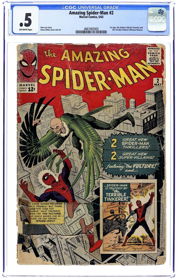 Cover art by Steve Ditko. First appearance of the Vulture in Duel to the Death with the Vulture!, script by Stan Lee, art by Steve Ditko; The Vulture is so confident in his abilities that he announces his plans to steal a diamond shipment to the police; When Spider-Man hears this he decides to stop the Vulture. The Uncanny Threat of the Terrible Tinkerer!, script by Stan Lee, art by Steve Ditko; When Peter Parker discovers some alien modifications to a professor's radio he tracks down a group of aliens with plans to take over the Earth. Reprinted in Marvel Tales # 139. 36 pgs. $0.12. Cover price $0.12.
