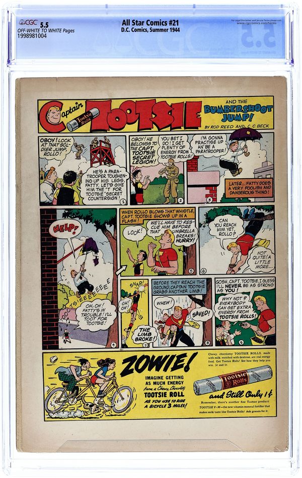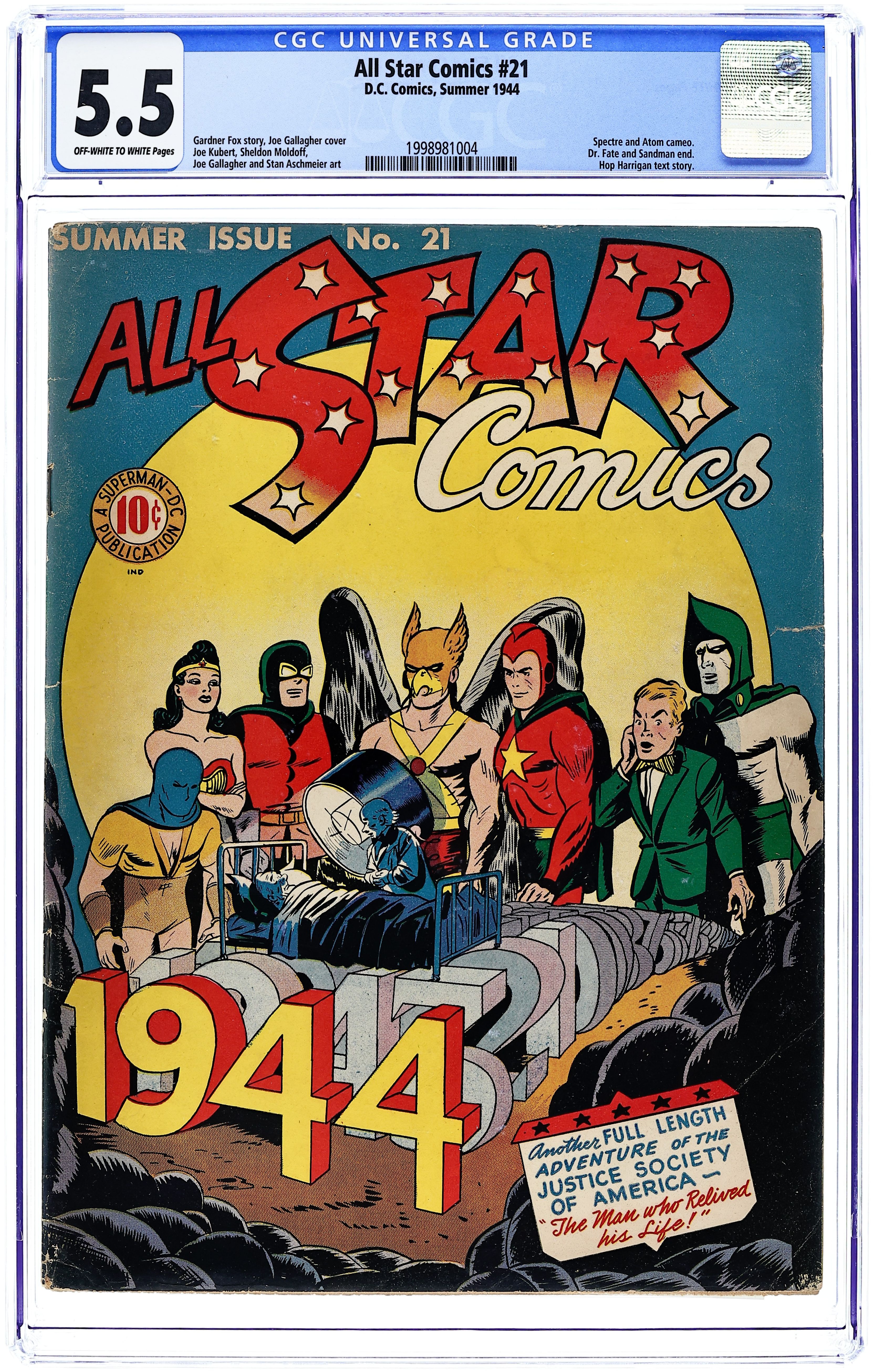 Summer 1944. The Justice Society of America star in "The Man Who Relived His Life!" Plot by Gardner Fox and Sheldon Mayer, script by Fox. Art by Joe Gallagher plus individual chapters featuring Hawkman (art by Shaldon Moldoff), the Sandman (art by Gallagher), Starman (art by Aschmeier), Dr. Mid-nite (art by Aschmeier), Doctor Fate (art by Joe Kubert), and Johnny Thunder (art by Aschmeier). Wonder Woman appearance. Two-page Hop Harrigan text story, "Express to Berlin." Tootsie Roll back cover ad, "Captain Tootsie and the Bumbershoot Jump" by Rod Reed and C.C. Beck. Gallagher cover. 52 Pages, Full Color. Cover price $0.10.