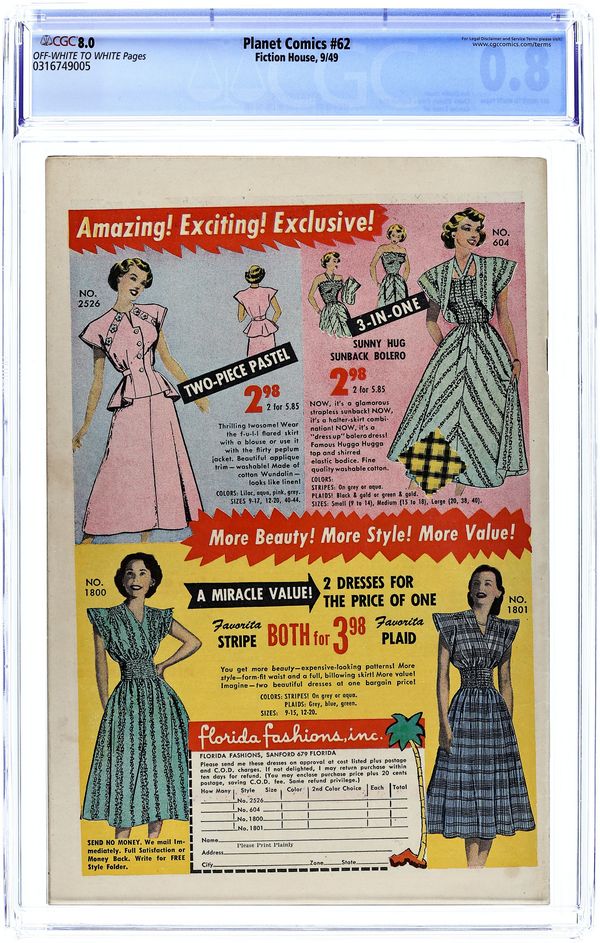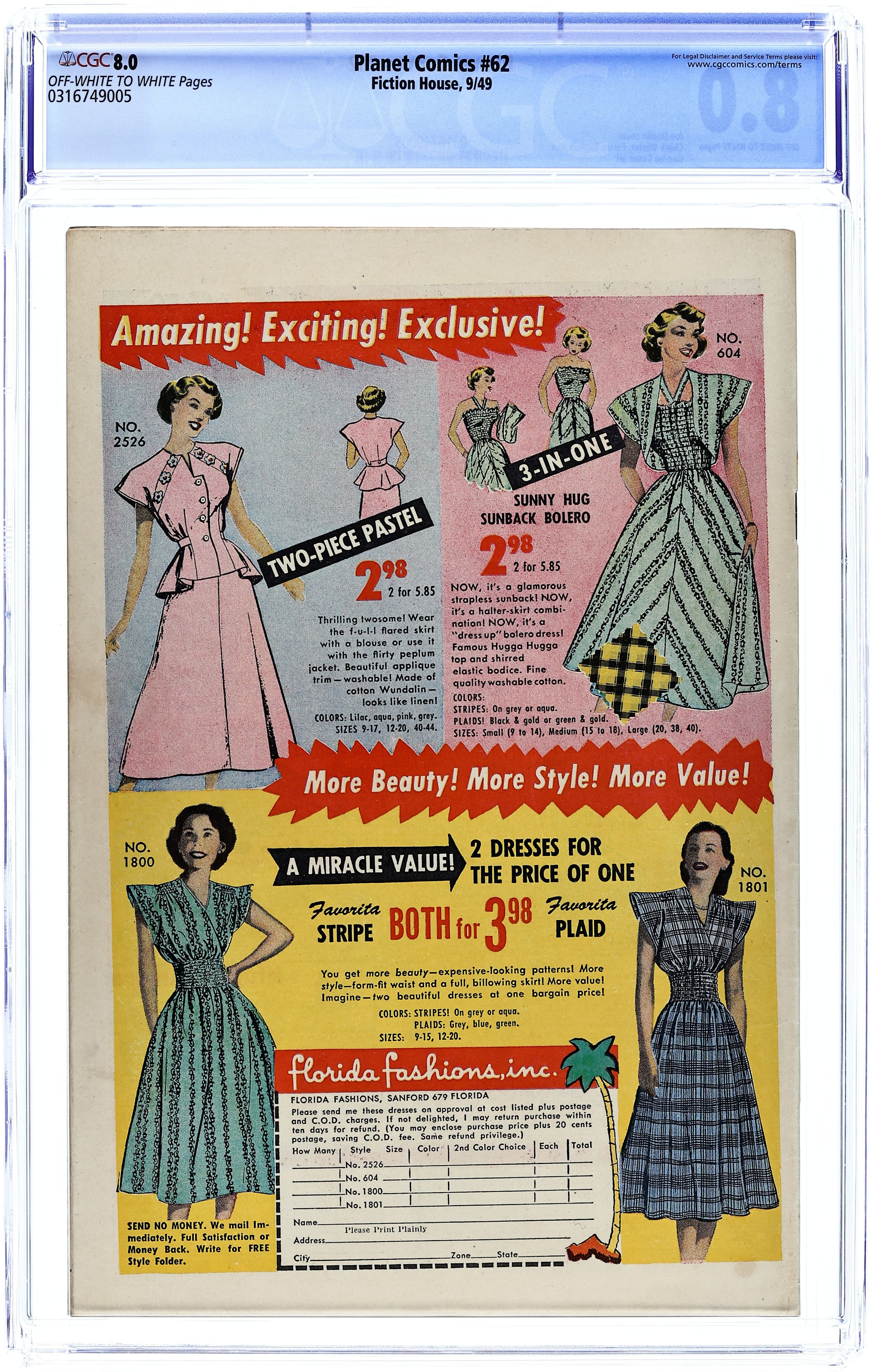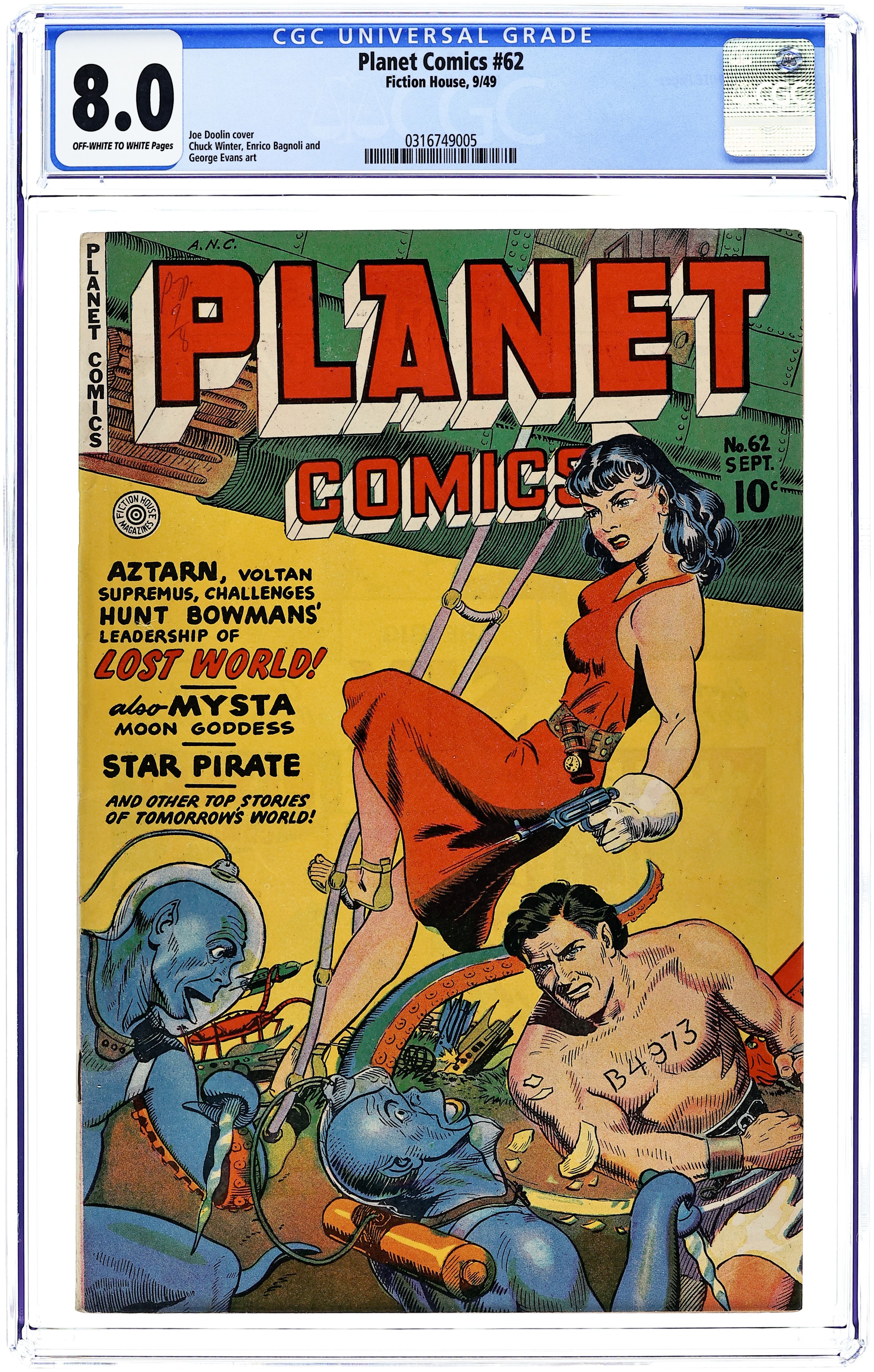 Cover by Joe Doolin. Edited by J. F. Byrne. Stories and art by George Evans, Enrico Bagnoli, and Charles A. Winter. The first true science fiction comic, Planet Comics featured classic space opera with square-jawed heroes, rockets, rayguns and bug-eyed aliens of every stripe. In the Lost World, Volta propaganda has the human survivors turning against each other; The final adventure of Mysta of the Moon; Futura and Blargo, held prisoner on Oceania by a group called the Heads, face evil duplicates of themselves, in a story with exquisite art by Enrico Bagnoli. The Lost World; Mysta of the Moon; The Star Pirate; The Song of Dhu; Futura. 36 pages, Full Color. Cover price $0.10.