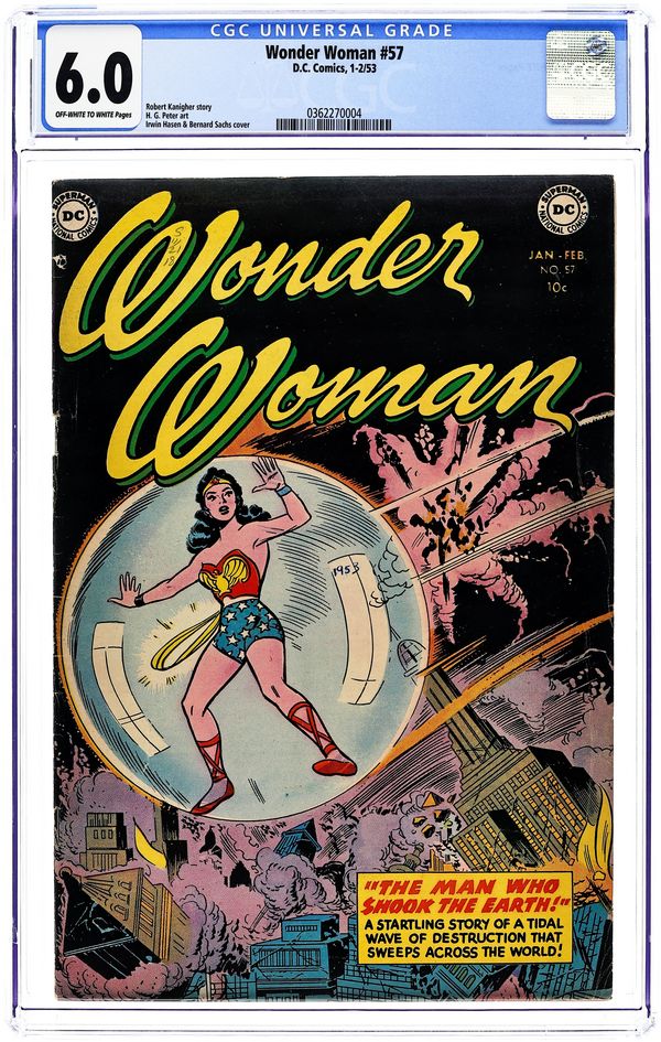 Cover pencils by Irwin Hasen, inks by Bernard Sachs. "The Man Who Shook the Earth," script by Robert Kanigher, art by Harry G. Peter; Wonder Woman vs. Mole Men. Wonder Women of History: three-page Marie Elizabeth Zakrzewska bio by Julius Schwartz. Superboy stars in a one-page public service announcement, "Superboy Discovers a New Kind of Junior Sport!" Superman is on Television! ad. "Her Crowning Glory" text article. 44 Pages, Full Color. Cover price $0.10.